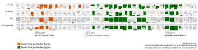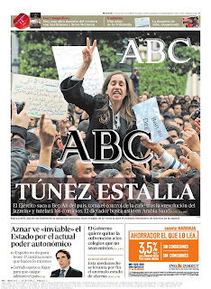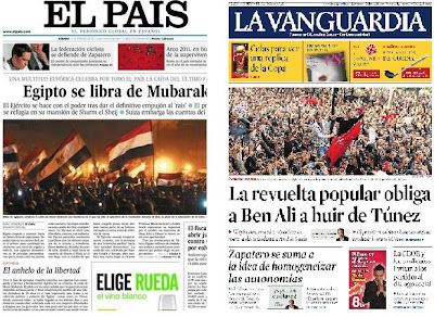 Lugar quizá menos común: durante un año, la revista de prensa tuvo un solo, inequívoco, color. Desde que Mohamed Buazizi se inmoló en Sidi Bouzid, prácticamente todo titular referido a los ciudadanos árabes o musulmanes respondía a lo que parecía casi un empeño por reforzar tres o cuatro estereotipos clave: lucha pacífica, empoderamiento de la mujer, democracia, nuevas tecnologías. En su labor de creadores de realidad, los medios occidentales parecían haber elegido en este asunto su sitio sin dejar lugar a dudas. Mensaje: «hay dos bloques, y ellos intentan ser parte del nuestro, y eso nos parece una idea estupenda».
