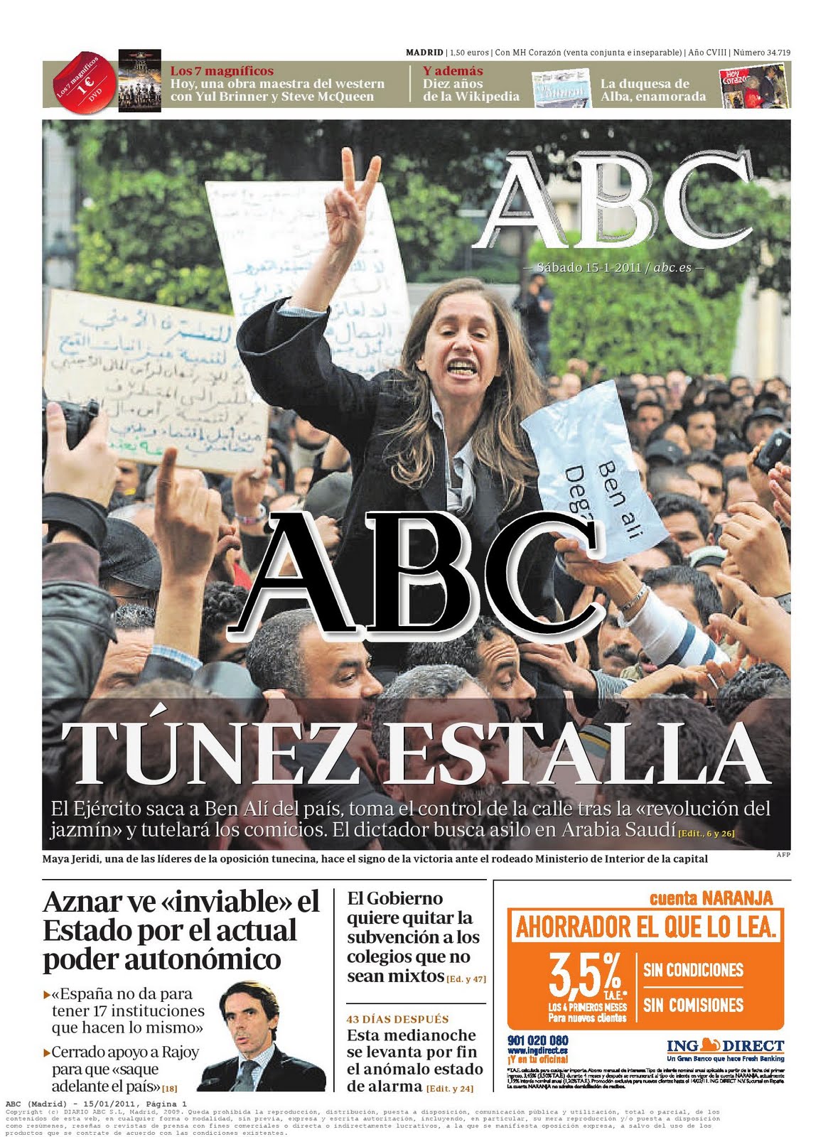 Lugar quizá menos común: durante un año, la revista de prensa tuvo un solo, inequívoco, color. Desde que Mohamed Buazizi se inmoló en Sidi Bouzid, prácticamente todo titular referido a los ciudadanos árabes o musulmanes respondía a lo que parecía casi un empeño por reforzar tres o cuatro estereotipos clave: lucha pacífica, empoderamiento de la mujer, democracia, nuevas tecnologías. En su labor de creadores de realidad, los medios occidentales parecían haber elegido en este asunto su sitio sin dejar lugar a dudas. Mensaje: «hay dos bloques, y ellos intentan ser parte del nuestro, y eso nos parece una idea estupenda».